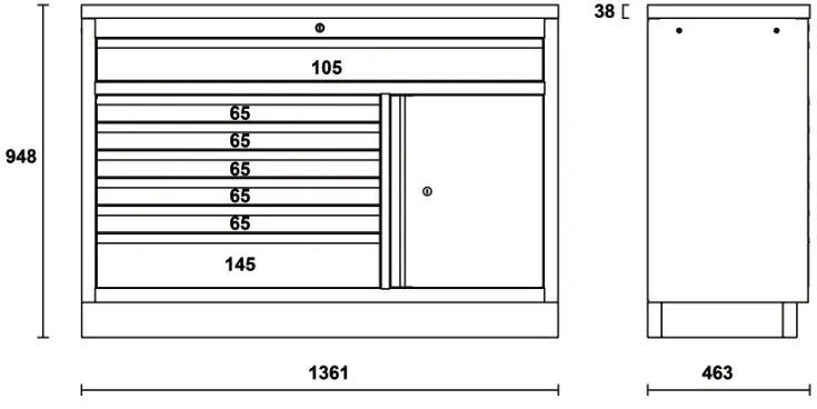 • 1 gaveta (1248×406 mm) com corrediças de rolamento de esferas