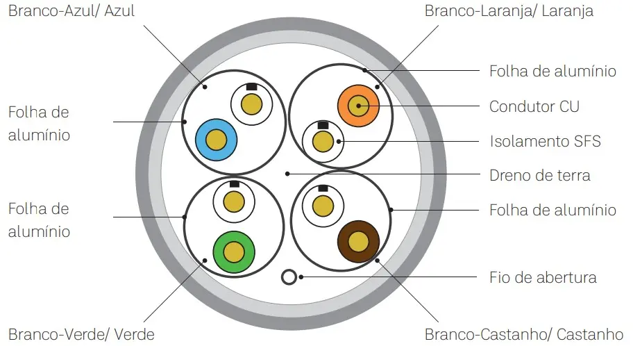 Revestimento: LSZH; ø 7,3mm ± 0,3 mm espessura; 0,55mm ± 0,05 mm