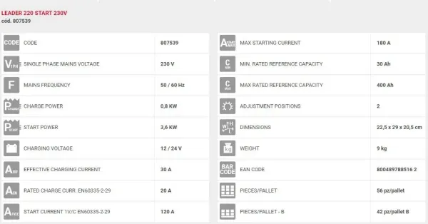 CARREGADOR DE BATERIA LEADER 220 START 230V