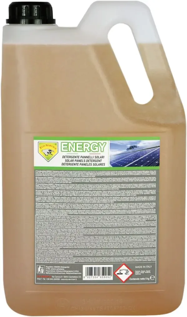 Detergente específico para a lavagem dos painéis fotovoltaicos e solares. Poder elevadíssimo de limpeza que permite uma remoção rápida e completa da sujidades, poluição, fuligem etc. Não deixa os vidros opacos nem com halos, não estraga as partes de alumínio, as ligas leves e as conexões de material plástico. A fórmula especial anti estática e hidrófuga de ENERGY aumenta a funcionalidade dos painéis solares pois previne e desacelera a formação de sujidade e de incrustações nas superfícies.