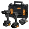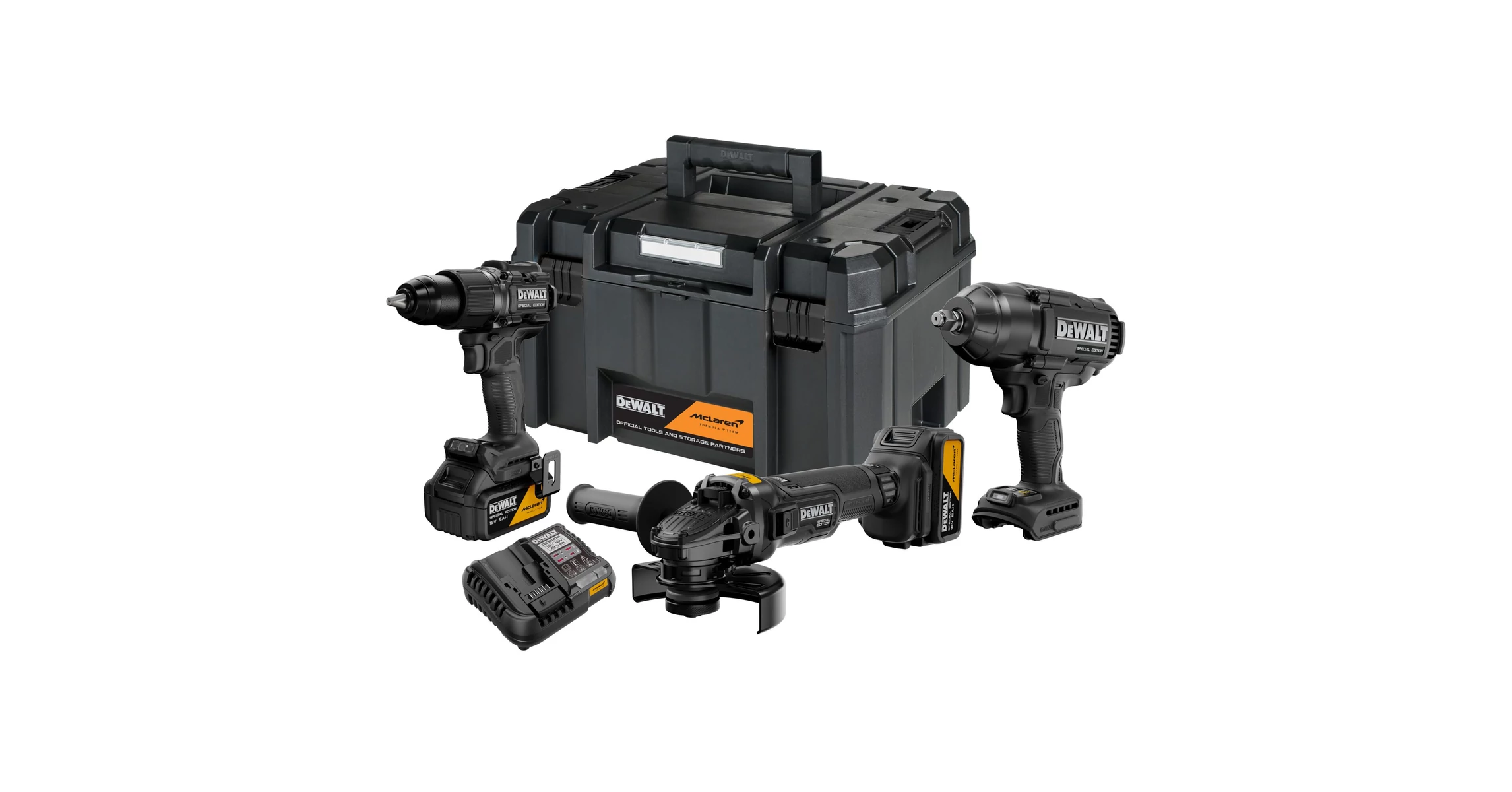 Kit XR 18V edição limitada McLaren: Berbequim Percussão com Motor sem escovas 90Nm , Chave de Impacto 1/2” Alto par com Motor sem escovas, Rebarbadora 125mm com Motor sem escovas, 2 baterias XR 18V Li-Ion 5Ah e Carregador Multi-voltagem XR.