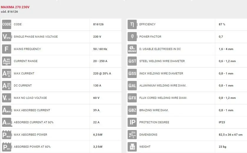 – Diametro fio solda fluxado: 0,8-1,2 mm