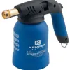 kit composto por: maçarico do artigo 1062E com pega ergonómica, chama do queimador TURBO M ,com sistema anti-inclinação e 2 cartuchos Kema-pro do art.581