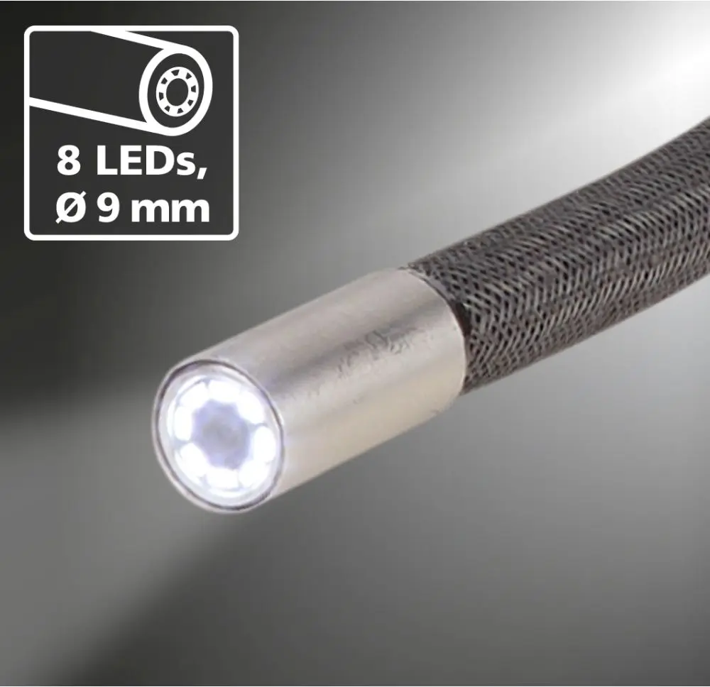 Descrição: Este sistema profissional de inspeção com vídeo oferece flexibilidade máxima mesmo para trabalhos complexos. Tem uma cabeça da câmara individualmente móvel que pode ser rapidamente ajustada à perspetiva ideal utilizando o joystick na unidade básica. Assim é possível inspecionar sítios de difícil acesso que não são visíveis com sistemas de câmara fixos. A inspeção é também muito fiável, uma vez que as vedações dos tubos, por exemplo, podem ser verificadas a 360° e as áreas danificadas podem ser detetadas com precisão. A cabeça e a sonda da câmara são à prova de água e resistentes a gasóleo, gasolina, óleo de motor, AdBlue®, álcool etílico e água salgada, o que torna o aparelho extremamente versátil. Outras vantagens são a iluminação LED do objeto de primeira qualidade e o suporte magnético para a montagem na unidade básica.