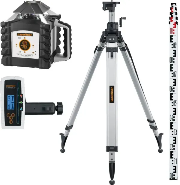 Inclui: Quadrum OneTouch, SensoLite 410, fixação universal, controlo remoto, acumulador, compartimento de pilhas, unidade de alimentação/ carregador incl. adaptador internacional, mala de transporte, pilhas, tripé de manivela profissional P 260 cm com alça de transporte, jogo FL: régua vertical Flexi Plus, FlexiSlider, jogo LT: vara telescópica de nivelamento LT 5 m