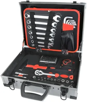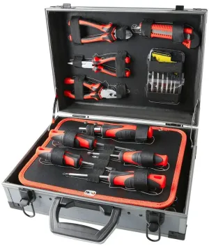 Combinação completa de alicates, chaves de fenda, roquetes, chaves de caixa, bits, chave Allen, cortador, fitas métricas, martelo, etc.