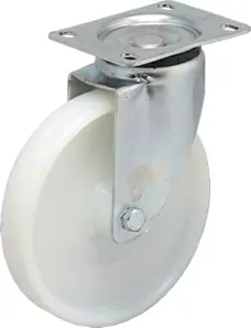 Rodízio giratório com duas pistas de esferas, suporte em aço estampado, zincado brilhante.