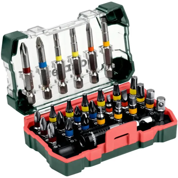 Pontas em aço cromo-vanádio (qualidade S2) com codificação por cores para encontrar de forma rápida e fácil a ponta adequada; adaptador magnético de substituição rápida; caixa robusta de elevada qualidade com design especial Metabo; gancho de suspensão com furo tipo “Euroloch” extensível; expositor de venda atrativo