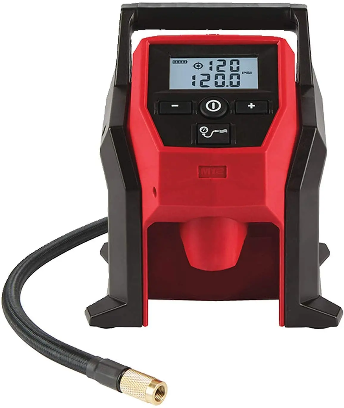 Compressor sub compacto M12™, pressão máxima 8,27bar (120PSI), precisão ±3%, comprimento da mangueira 660mm. Inclui agulha, ponta presta, bocal de inflagem e bocal schrader. Fornecido em versão zero, sem baterias nem carregador