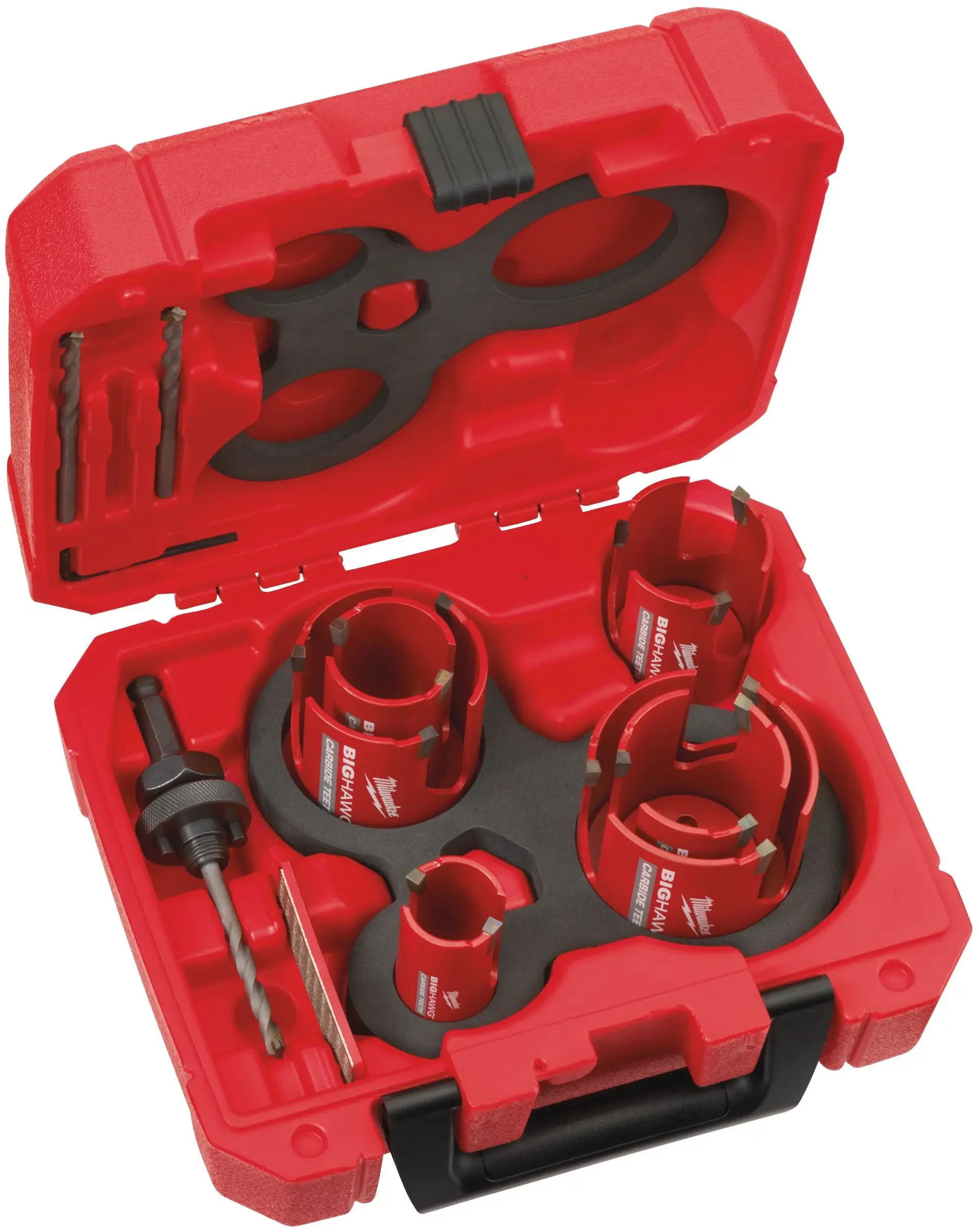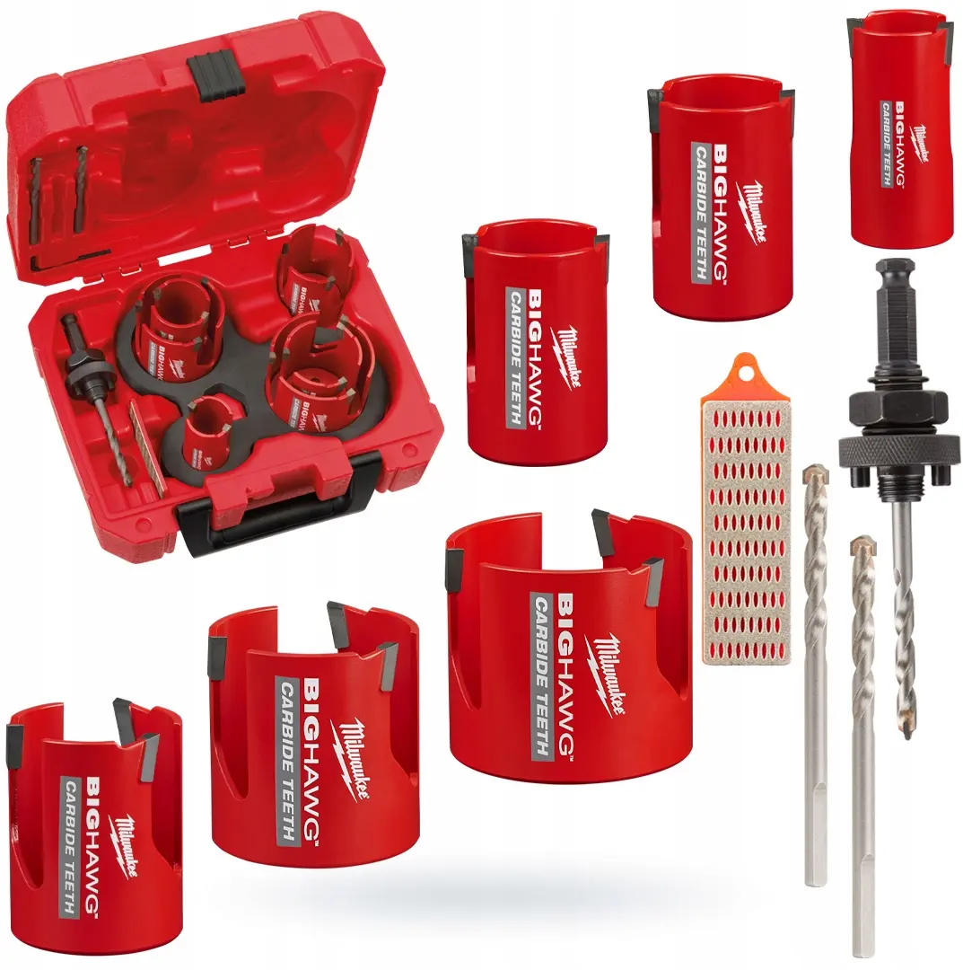 Coroas multimaterial BIG HAWG™: 35, 44, 51, 57, 68, 76 mm. Adaptador com broca piloto, 2 brocas piloto, afiador de diamante e chave allen.