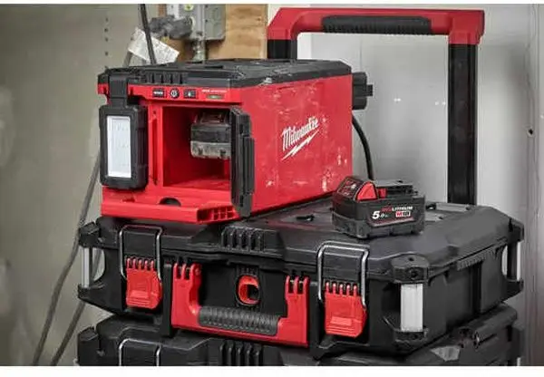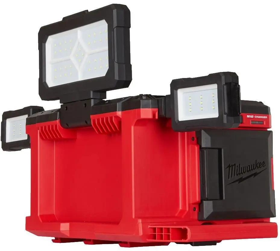 Luz de área/carregador LED M18™ TRUEVIEW™ PACKOUT™, proteção IP54, 3 cabeça individuais, híbrido AC/DC, carregador integrado M18™ y USB 2.1A, 3 modos de iluminação – 3.000/1.500/1.000/- Lumens. Fornecida em versão zero, sem baterias nem carregador