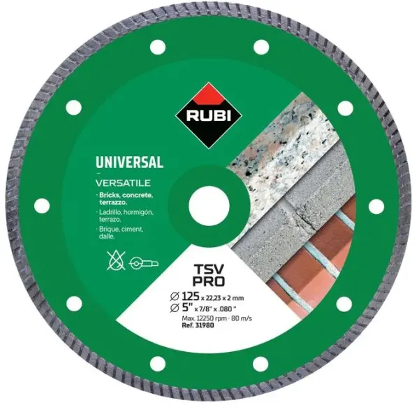 Com o disco de diamante TURBO- TSV, RUBI põe à disposição do profissional da construção um disco de corte, a seco para rebarbadora, de materiais gerais de obra como cerâmica, tijolo, cimento, pedra. Uma grande combinação. Alto rendimento de corte com acabamentos de alta qualidade.