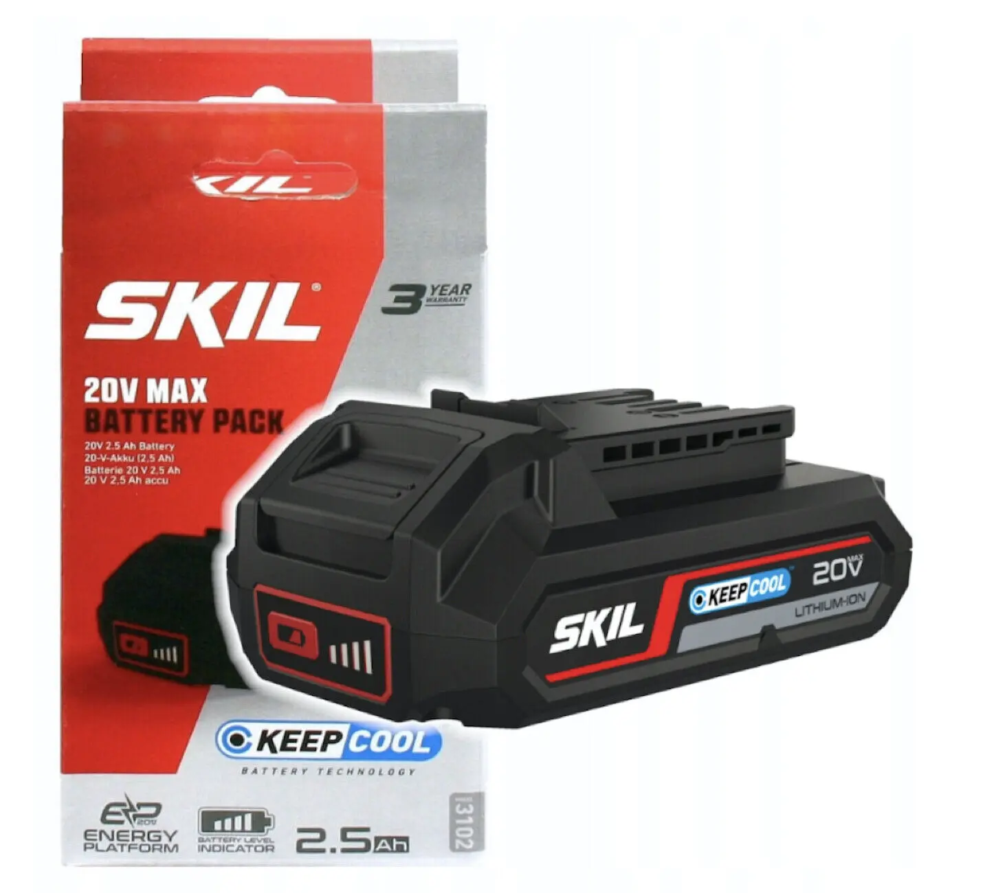 Esta bateria «20V Max» (18 V) 2,5 Ah extremamente potente com indicador LED do nível de carga dispõe da superior tecnologia de iões de lítio, o que significa que não há efeito memória, não há descarga espontânea e está sempre pronta a utilizar. Parte da «Energy Platform» da SKIL: O sistema de bateria flexível. «Keep Cool™» arrefece as células da bateria para evitar o seu sobreaquecimento, o que aumenta a autonomia em até 25% e duplica a vida útil da bateria! A tecnologia «ActivCell™’ serve para otimizar o consumo de energia, evitando o sobreaquecimento e maximizando o desempenho da bateria.