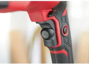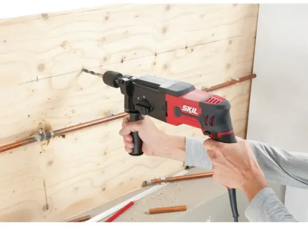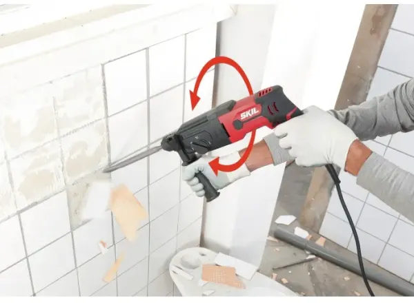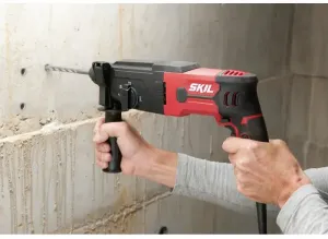 O martelo rotativo pneumático SKIL 1770 com quatro funções dispõe de um potente motor de 850 W, um interruptor de velocidade variável com pré-seleção e um botão de bloqueio para um controlo ideal dos trabalhos de perfuração em betão até 26 mm. Dispõe de uma função de percussão para perfurar em betão, uma função de paragem da percussão para uma perfuração e aparafusamento regulares e de uma função de paragem de rotação para trabalhos de cinzelagem ligeiros. Por último, mas não menos importante, este berbequim permite uma cinzelagem com rotação livre. O sistema «SDS+» permite uma mudança de acessórios simples e rápida. Pode usar o interruptor para apertar/desapertar para mudar, de forma cómoda, a direção de trabalho da ferramenta. O Softgrip antiderrapante e o punho lateral ajustável permitem um controlo confortável com as duas mãos. Com o prático batente de profundidade, pode definir a profundidade de perfuração para furos cegos. O SKIL 1770 GA é fornecido numa mala resistente com um jogo de três brocas para betão «SDS+» de 6, 8 e 10 mm e uma bucha de 13 mm com adaptador «SDS+».