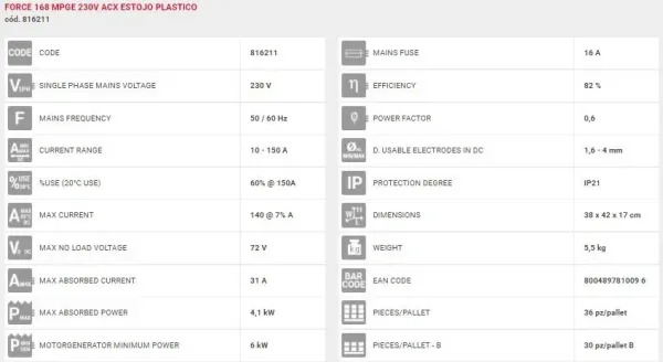 TELWIN MÁQUINA DE SOLDAR INVERTER FORCE 168 MPGE