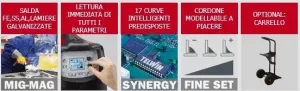 O ajuste rápido SYNERGIC para os parâmetros de soldadura, graças à tecnologia ONE TOUCH LCD SYNERGY, torna o produto muito fácil de usar.