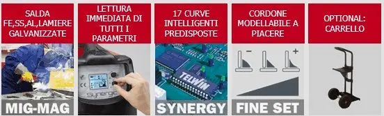 A Technomig Dual Synergic é a solução perfeita para uma vasta gama de aplicações, desde a manutenção à instalação e intervenções em oficinas bate-chapas graças à sua versatilidade e adaptação da soldadura a diferentes materiais (aço, aço inoxidável, alumínio), e soldobrasagem (chapa galvanizada).