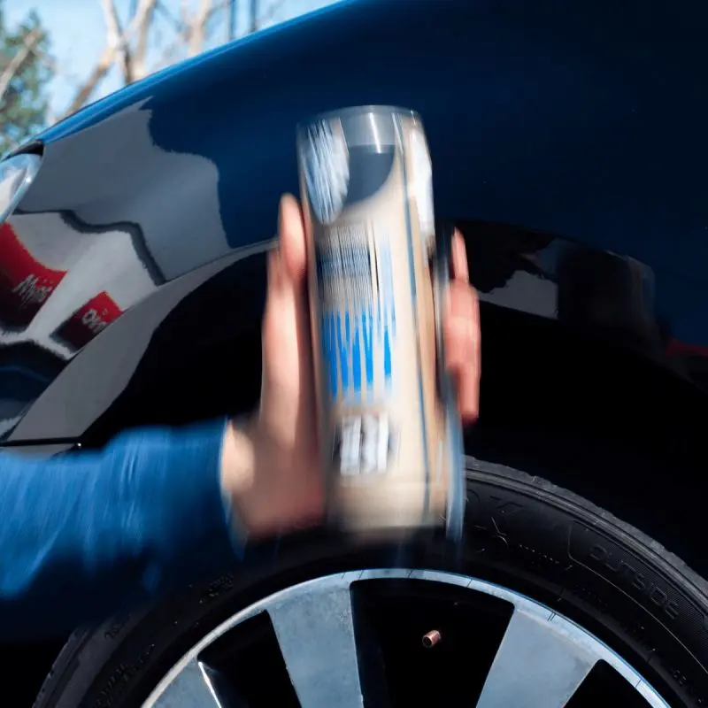 O K2 TIRE DOKTOR repara pneus furados de forma rápida e temporária, sem desmontagem, usando um aerossol para bombear o pneu e uma fórmula de látex para selar o buraco.