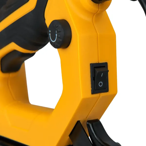 Regulador de impacto ( “-” para materiais finos / leves – folhas e tecidos e “+” para materiais grossos / duros – madeiras e paredes).