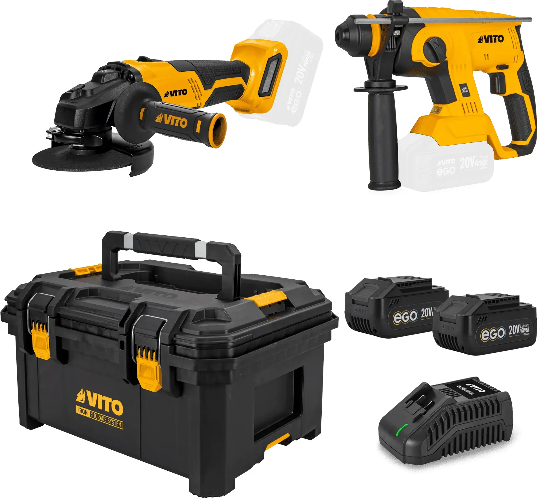 Este PACK da VITO (PACK3EGOIRON) inclui um Martelo Perfurador Brushless 20V, uma Rebarbadora Brushless 20V – 125MM, uma bateria 20V EGO de 4Ah, uma bateria 20V EGO de 6Ah, um carregador rápido 20V e uma mala modular média.