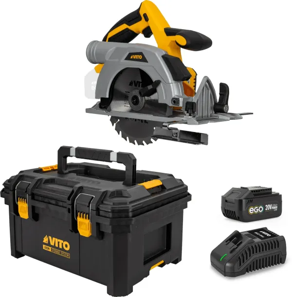 Este PACK da VITO (PACK12EGOIRON) inclui uma Serra Circular Brushless 20V – 165MM, uma bateria 20V EGO de 5Ah, um carregador rápido 20V e uma mala modular média.