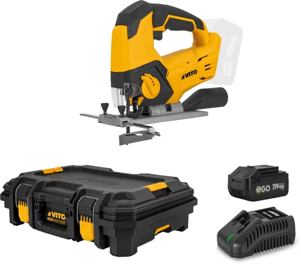 Este PACK da VITO (PACK11EGOIRON) inclui uma Serra de Recortes 20V, uma bateria 20V EGO de 4Ah, um carregador rápido 20V e uma mala modular top.