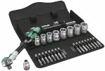 Chave combinada de catraca de alta qualidade da Wera: tudo o que uma chave deve ser capaz de fazer. E muito mais. Mais rápido, melhor e elegante. Sim, um verdadeiro Coringa. A nova geração de chaves de catraca combinadas. Conjunto de 11 peças em bolsa robusta. Adequado para cabeças de parafusos sextavados ou porcas. Possui função de fixação, graças à placa metálica na mandíbula, que reduz o risco de queda de porcas e parafusos. A placa de metal substituível na mandíbula fixa porcas e parafusos com seus dentes extraduros e limita o perigo de escorregamento. O batente de limite integrado evita qualquer deslizamento ao redor da cabeça do parafuso e permite a aplicação de um torque mais alto. A geometria hexagonal dupla proporciona uma conexão positiva com porcas ou parafusos e reduz o risco de escorregamento. Um ângulo de retorno de apenas 30° na extremidade aberta evita qualquer movimento demorado da chave durante os trabalhos de fixação. O mecanismo de catraca na extremidade do anel, com um mecanismo excepcional de dentes finos – 80 dentes no total – permite flexibilidade mesmo em espaços de trabalho muito confinados. A geometria especialmente forjada proporciona alta transferência de torque e resistência. Fabricado em aço cromo molibdênio de alto desempenho com revestimento de níquel-cromo para alta proteção contra corrosão. Localizador de ferramentas “Acalme-se” com codificação de cores de acordo com os tamanhos.