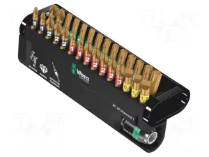 Brocas com pequenas partículas de diamante na ponta da broca. Isso garante um encaixe seguro na cabeça do parafuso, reduz a pressão de contato necessária e diminui o risco de escorregamento. Brocas BiTorsion com uma zona de torção – onde a energia cinética é desviada das cargas de pico. Isso estende muito a vida útil do produto. Vem com tecnologia Rapidaptor, que permite que as brocas sejam fixadas sem a necessidade de acionar a luva. A remoção da broca é simples, bastando empurrar a luva para frente – para uma troca rápida da broca com apenas uma mão. Para inserção na parafusadeira elétrica ou no mandril da furadeira elétrica. O Bit-Check multicomponente convence por conta de seu baixo peso e do máximo grau possível de compactação. A este respeito, o material macio na seção inferior do Bit-Check garante que as brocas sejam seguras com segurança, sendo simples de remover ao mesmo tempo. O perfil e o tamanho das brocas são fáceis de reconhecer graças ao Wera “Take it easy” Tool Finder com sua codificação de cores e impressão claramente visível.