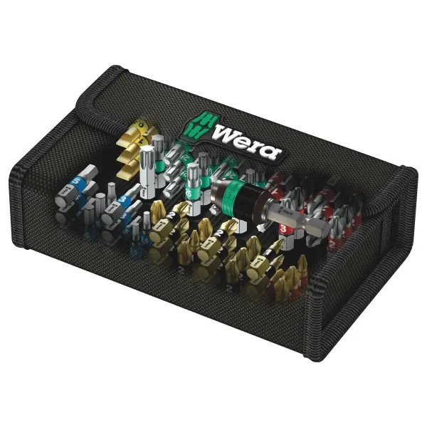 Caixa têxtil robusta com brocas e suporte, 61 peças. 49 brocas BiTorsion para longa vida útil, em design com revestimento de diamante (BDC) para um encaixe seguro na cabeça do parafuso, resistente à absorção (BTZ), para uso universal, extra duras (BTH); 11 brocas, resistentes à absorção (Z), para uso universal. 1 suporte universal 889/4/1 K com mandril de liberação rápida para prender na parafusadeira elétrica ou usar no mandril da furadeira elétrica. O perfil e o tamanho das brocas são fáceis de reconhecer graças ao Wera “Take it easy” Tool Finder com sua codificação de cores e impressão claramente visível. A caixa têxtil permite aos usuários um alto grau de mobilidade com um requisito mínimo de espaço. O peso bastante reduzido de um conjunto torna o transporte muito mais agradável. As superfícies sensíveis são protegidas quando a caixa é colocada no chão – mas a caixa têxtil ainda é muito robusta. A caixa e as ferramentas sobreviverão até mesmo a uma queda ilesas.