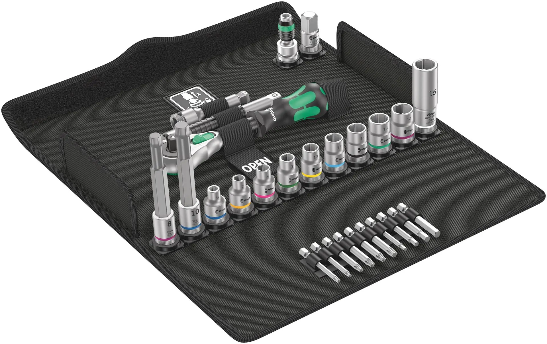 1 catraca Zyklop Speed com acionamento de 3/8″, 10 chaves de caixa Zyklop, 2 chaves de boca Zyklop de 30 mm e área de perfil extra fina para melhor acessibilidade em espaços de trabalho apertados. Com localizador de ferramentas Take it easy: Codificação de cores por tamanho. 1 extensão Zyklop ( curto) com luva de rotação rápida, 1 extensão Wobble, 1 adaptador de broca, 1 peça de conexão Cabeça quadrada externa de 3/8″ a cabeça quadrada externa de 1/2″, 10 bits, resistente, para uso universal. Arranjo de conjunto incrivelmente compacto para muitos ferramentas em um espaço apertado graças à caixa têxtil altamente robusta e durável. Pode ser colocado na posição vertical para armazenamento organizado na prateleira da oficina. Proteção de superfície adicional devido ao material externo têxtil. Baixo peso e tamanho pequeno para melhor mobilidade.