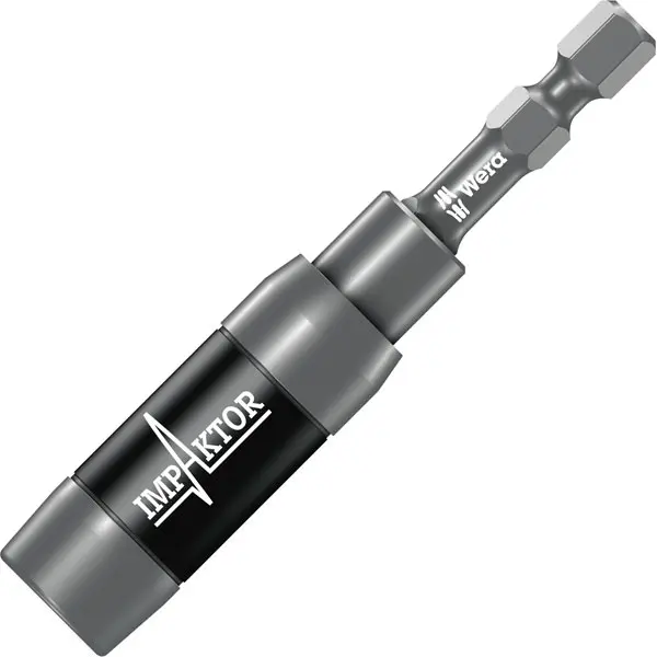 Suporte Wera Impaktor para absorção de picos de impulso. Efeito de torção especial graças à mola de torção dupla. O suporte Impaktor também segura parafusos longos e pesados de forma extremamente segura com seu ímã de anel. Isso permite um posicionamento rápido e confiável do parafuso. Caso, devido à situação, o ímã não seja desejado, por exemplo, ao trabalhar com metal, ele pode ser removido da zona de aparafusamento e, assim, neutralizado. Usado principalmente para aplicações de ferramentas elétricas manuais. Saída: adequado para bits com acionamento de cabeça sextavada de 1/4″ conforme DIN ISO 1173-C 6.3. Acionamento: hexagonal de 1/4″, adequado para parafusadeiras elétricas com recolhimento conforme DIN ISO 1173-F 6.3.